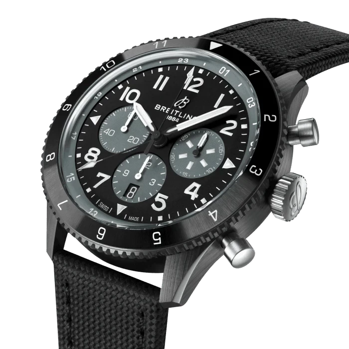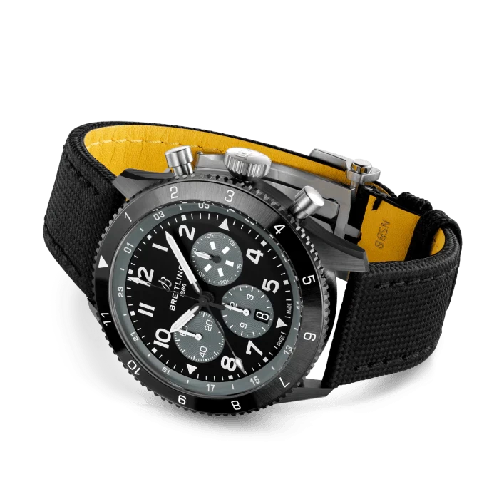 SB04451A1B1X1 Breitling This watch has a 46 mm black ceramic case. Bidirectional rotating black ceramic bezel. Black dial with three gray sub-dials. Arabic numerals with luminescent coating. Black and white hour hands with luminescent coating. Central second hand. This watch has three chronograph sub-dials at 3 ,6 and 9 o'clock. The date window is located at the 6 o'clock position. The watch performs following functions: hours, minutes, seconds, date, chronograph. Self-winding mechanical movement is powered by a Сalibre B04 (Manufacture). Power reserve approximately 70 hours. Case Thickness - 15.9 mm. Case back is transparent. Sapphire crystal protects front and back side of the watch. Black calfskin leather strap with folding clasp buckle. This model is water-resistant up to 100 m.