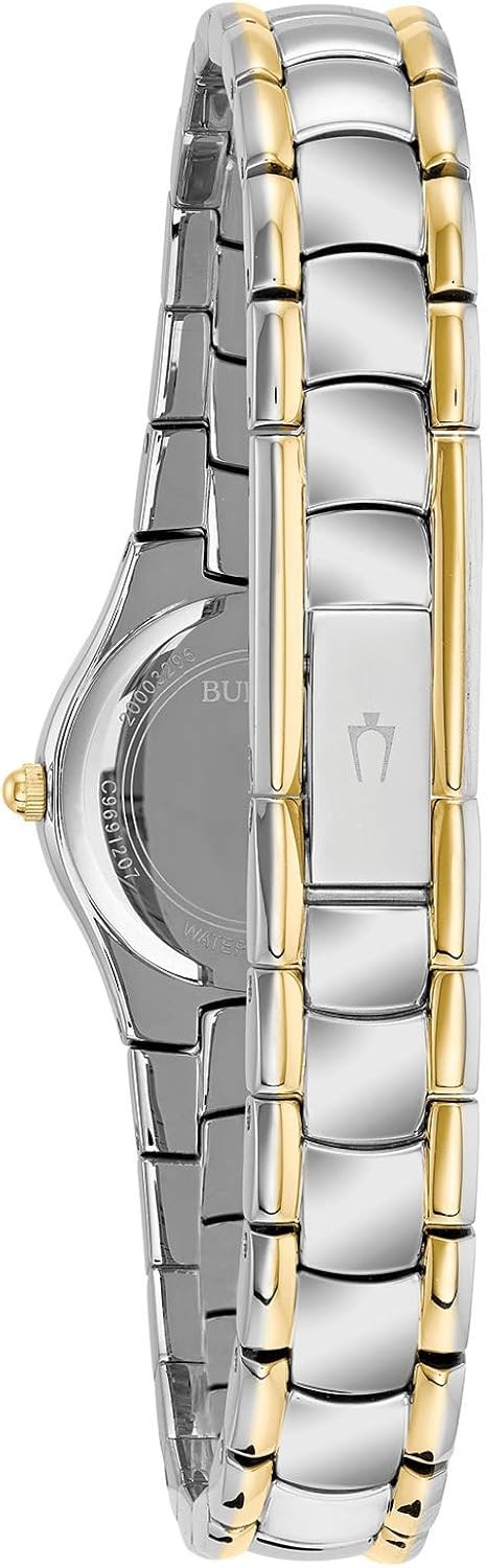 Due to a recent redesign by Bulova, recently manufactured Bulova watches, including all watches sold and shipped by Amazon, will not feature the Bulova tuning fork logo on the watch face. Protective mineral crystal dial window, Crystal: Mineral, Case Diameter: 22.5 mm, Case Thickness: 6.4 mm Japanese quartz movement with analog display Features jewelry clasp and coin-edge crown Water resistant to 99 feet (30 M): withstands rain and splashes of water, but not showering or submersion
