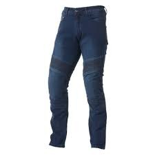 Riding jeans made of abrasion-resistant denim with DuPont Kevlar lining in impact zones and pockets for knee armor.