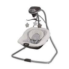 Baby swing with 6 swing speeds, 2-speed vibration, 15 songs, and removable seat that becomes a portable rocker.