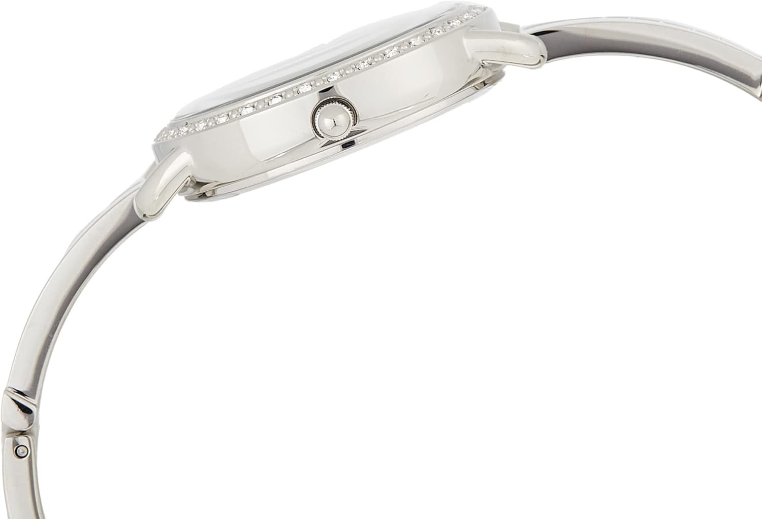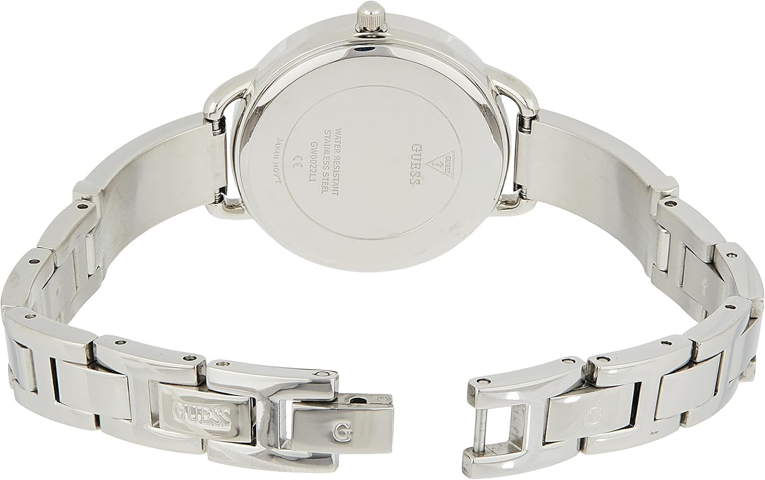 Self-adjustable g-link closure with a silver stainless steel strap and crystal accents Tonal silver dial with diamond markers Silver-tone 30mm stainless steel case with mineral glass crystal Crystal detailing along the bezel Water resistant to 30m (100ft): in general, withstands splashes or brief immersion in water, but not suitable for swimming or bathing