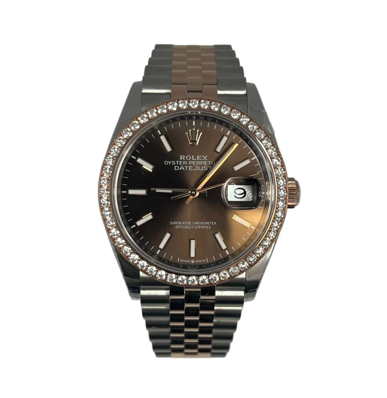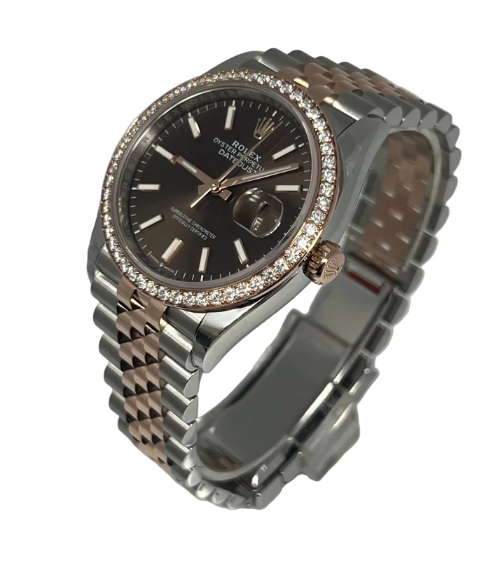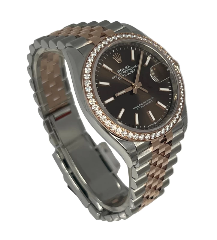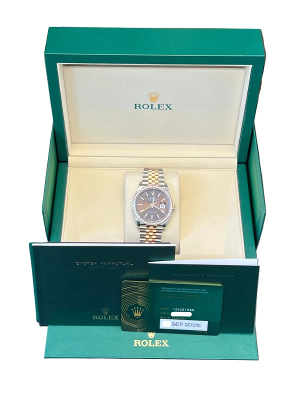 Indulge in the epitome of luxury with the Rolex 126281RBR. This stunning timepiece features a 36 mm Stainless Steel case with, that radiates sophistication. Fixed 18K Rose Gold bezel set with diamonds, enhances the overall aesthetic.