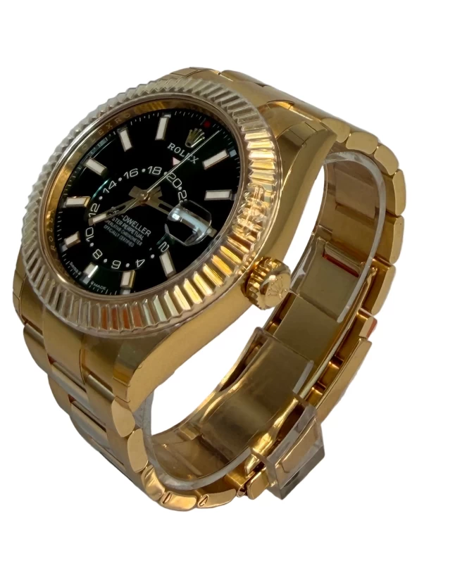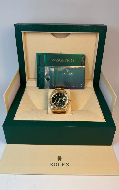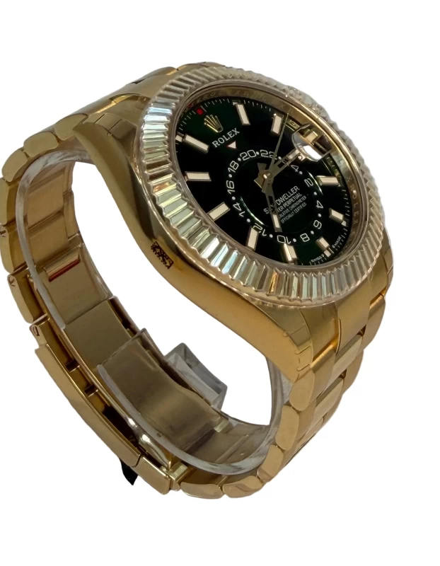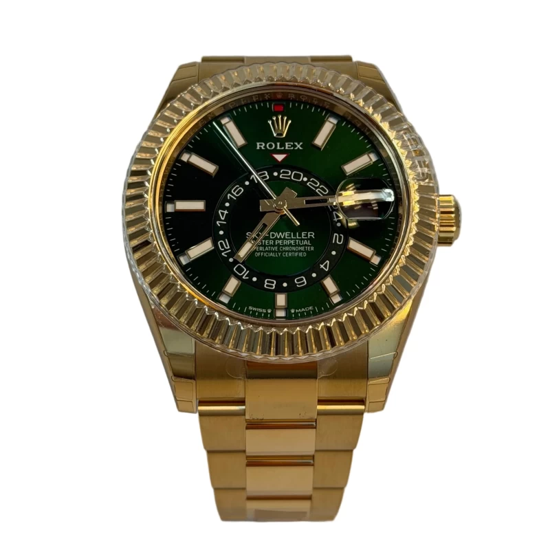Rolex Sky-Dweller 336938 NEW 2025: Exquisite Elegance and Masterful Craftsmanship. This stunning timepiece features a 42 mm 18K Yellow Gold Oyster case that radiates sophistication. Bidirectional rotatable fluted 18K Yellow Gold bezel enhances both function and aesthetics. Green dial with bright legibility. Polished hands and applied hour markers. The watch performs the following functions: hours, minutes, seconds, date, month, and dual time (second time zone) with an annual calendar. This watch is powered by the self-winding Caliber 9002 and boasts a power reserve of approximately 72 hours, ensuring precision and reliability. A sapphire crystal protects the front side of the watch. 18K Yellow Gold Oyster bracelet with folding clasp, ensuring both comfort and style. Water-resistance up to 100 m underscores everyday durability.
